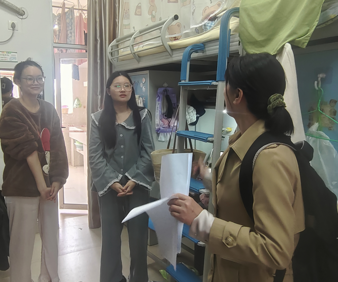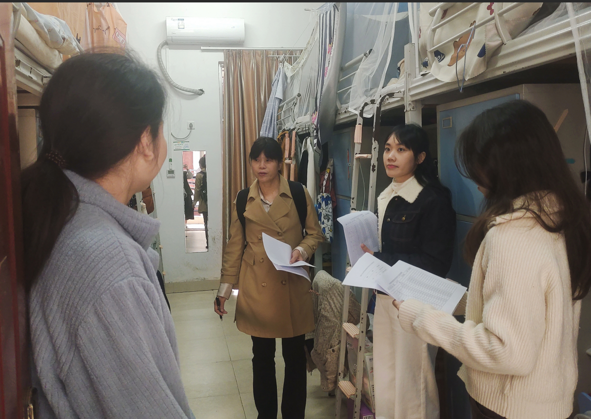 本次走访活动主要聚焦用电安全、消防通道、卫生环境及违规物品四大重点,既逐间排查私拉电线、大功率电器使用等违规用电行为,也重点核验消防通道畅通性与水电设施运行状况,切实保障住宿环境安全有序。针对部分宿舍内杂物堆积等情况,老师们现场提醒并督促学生及时整改。此外,在走访宿舍过程中,领导老师们与学生亲切交谈,细心询问大家的学习生活状况,尤其叮嘱冬季用电安全、保暖防寒等注意事项。