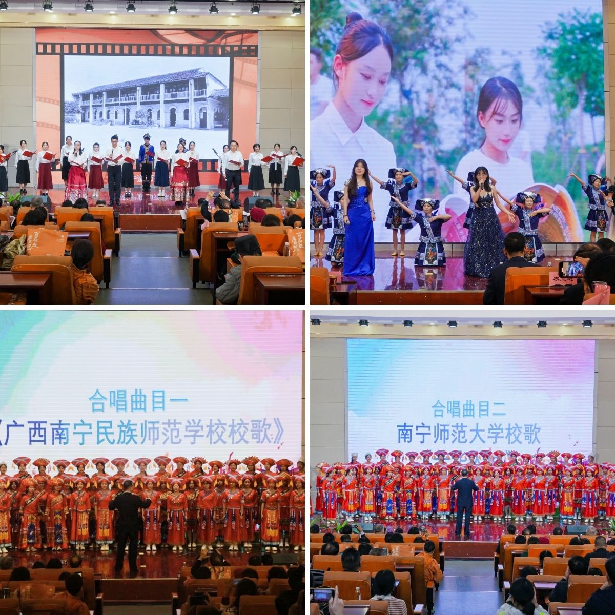 办学120周年撰写的诗词《追光而遇,沐光而行》;校友代表与在校学生逐一献上原广西南宁民族师范学校莫一军老师原创的经典歌曲。大会最后在原广西南宁民族师范学校校歌以及南宁师范大学校歌《芳华人间》中落下帷幕。全体嘉宾及校友移步理综楼前合影留念,定格这一意义非凡的时刻。