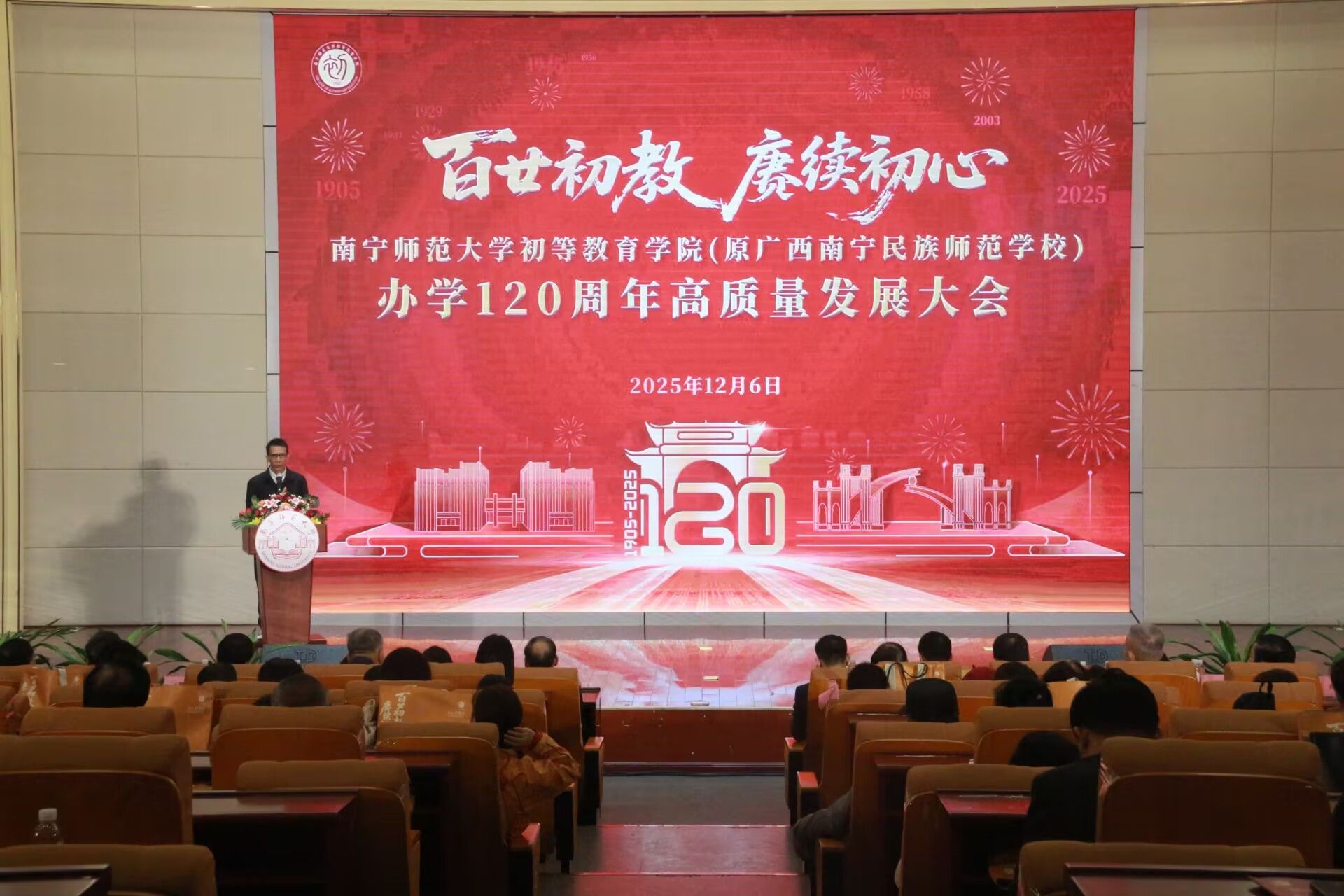 (原广西南宁民族师范学校)在五合校区文综114报告厅举行办学120周年高质量发展大会。各级领导、海内外校友、兄弟院校代表、行业嘉宾及全院师生代表欢聚一堂,共同见证这一承载历史荣光、迈向未来征程的重要时刻。大会通过线上线下同步直播,各地校友及社会各界人士共襄盛举,云端观礼人数超百万。